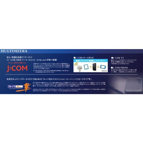 | オススメ | ○ ●インターネット:①J-COMネット 入居時(退去時)、無線モデムの取り付け工事(撤去工事)の申込要(J-COM 0120-999-000)、ルーター不要 ②フレッツ光 別途個別契約(有料) |